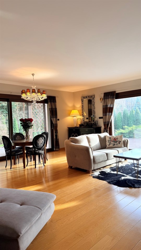 Powierzchnia działki 3 900 m² - idealny, kwadratowy kształt, pełne ogrodzenie z deski dębowej, dojrzały ogród, 1/3 działki to prywatny las.