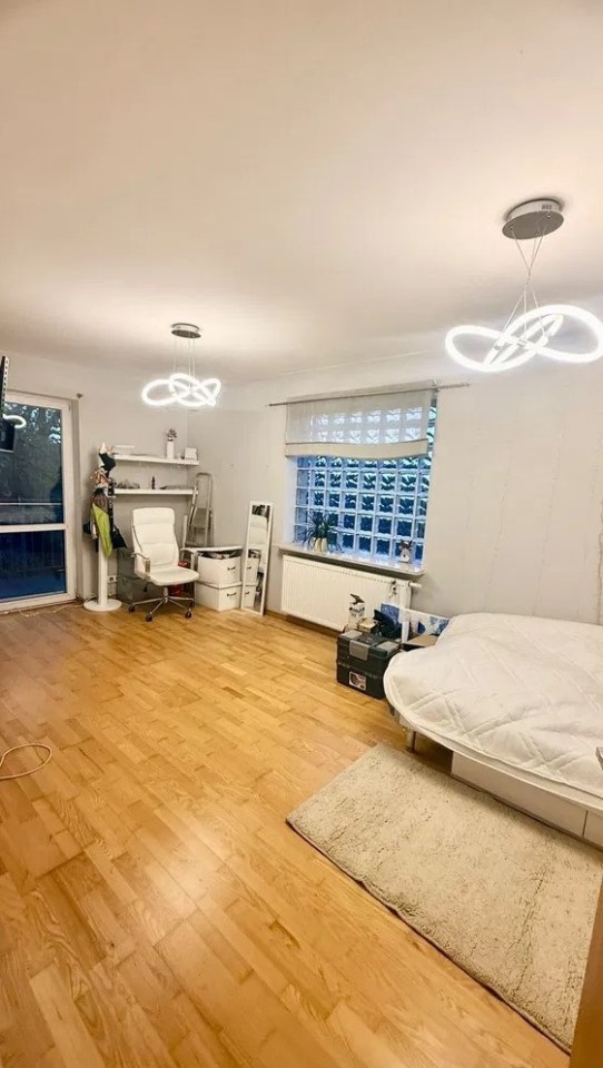 - dużego salonu z aneksem kuchennym i balkonem (ok. 32 m²),